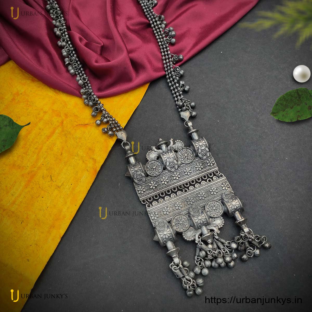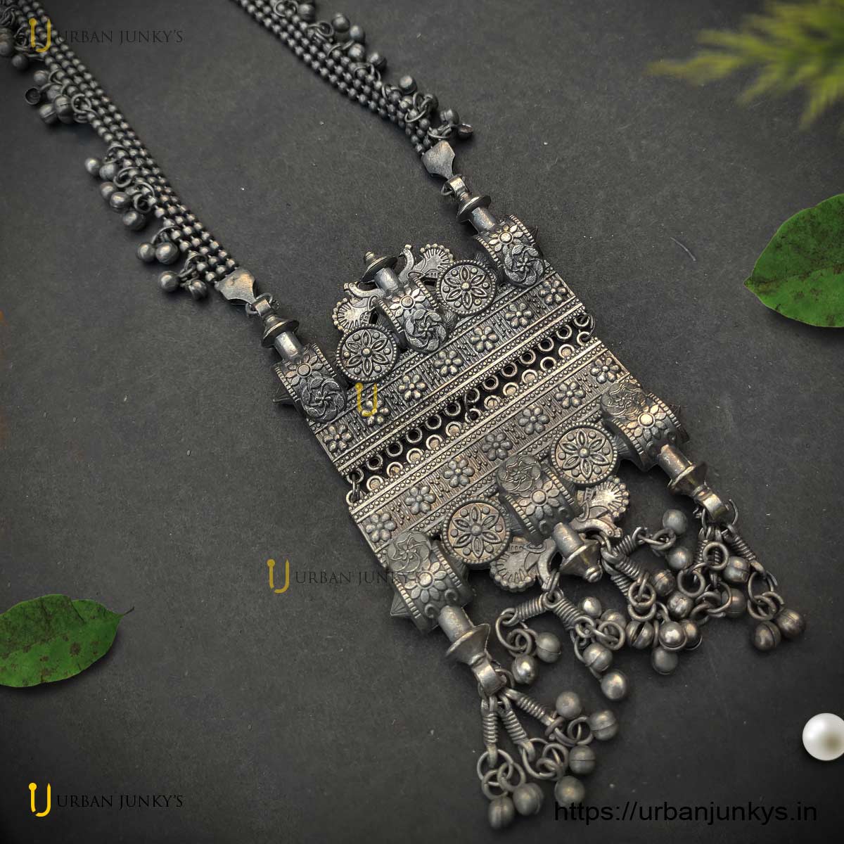 antique looking long necklace in black polish