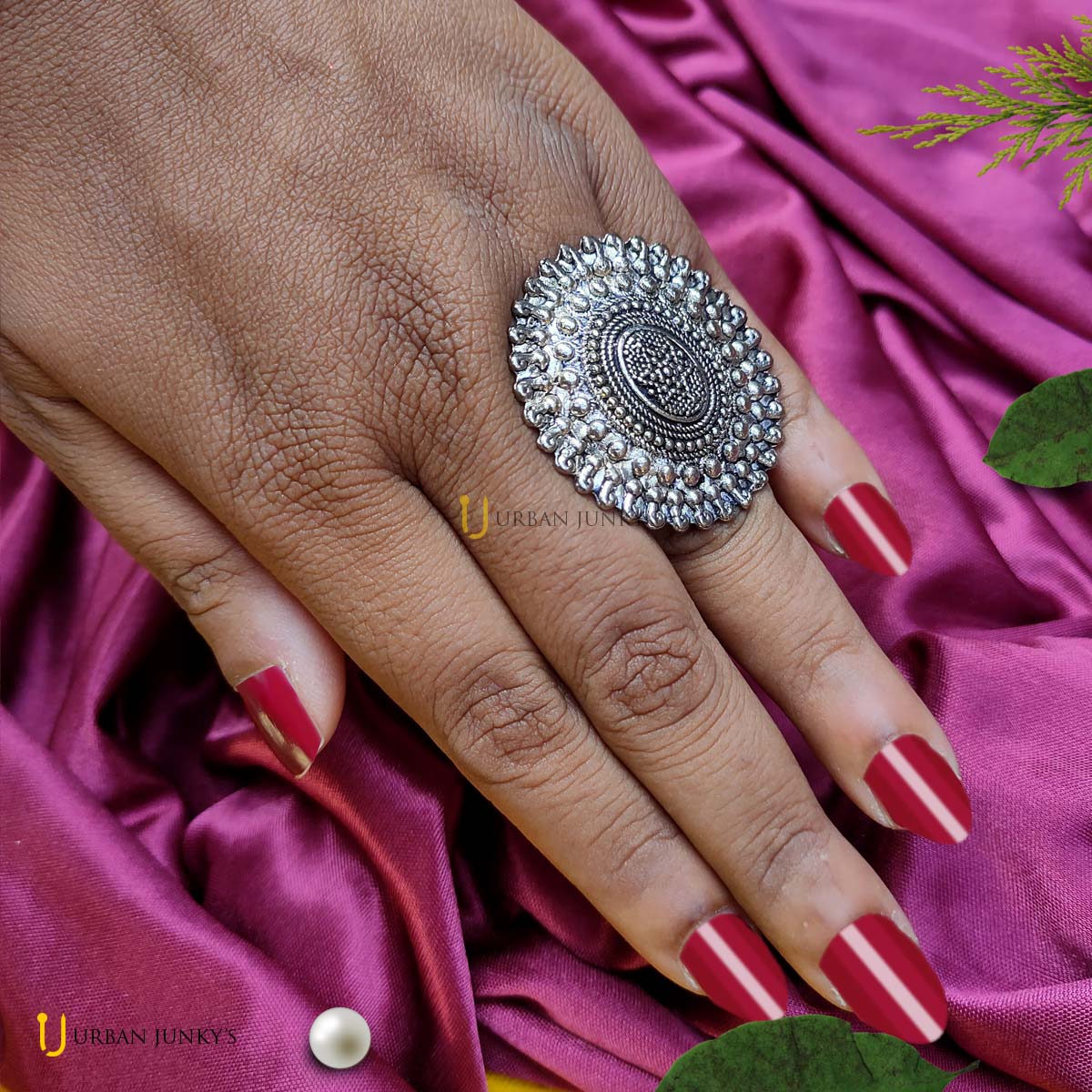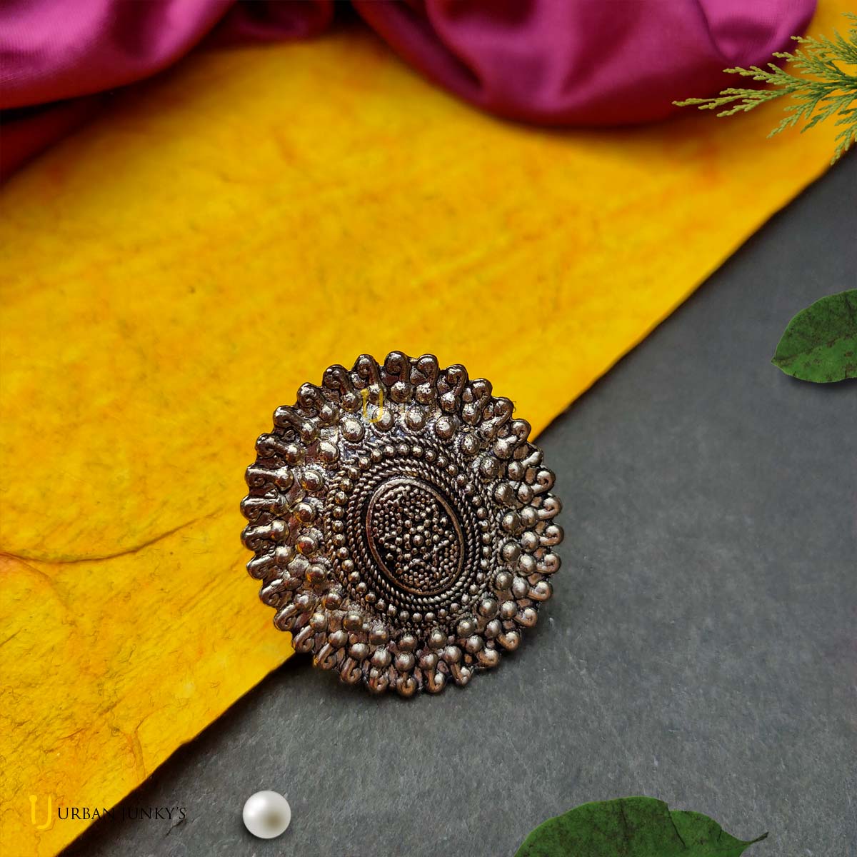 This is a medium sized earring. It is crafted with silver lookalike metal. It is a jhumka with sunflower motif.