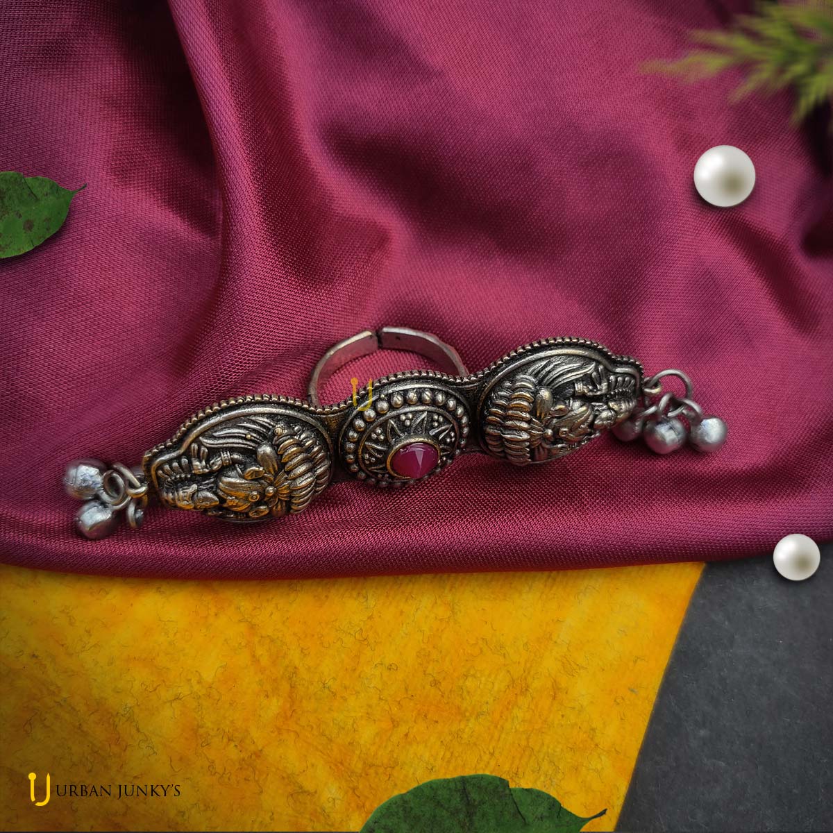 This one is a silver look alike finger ring. It is created with black polish metal. It is big in size, crafted with a stone.