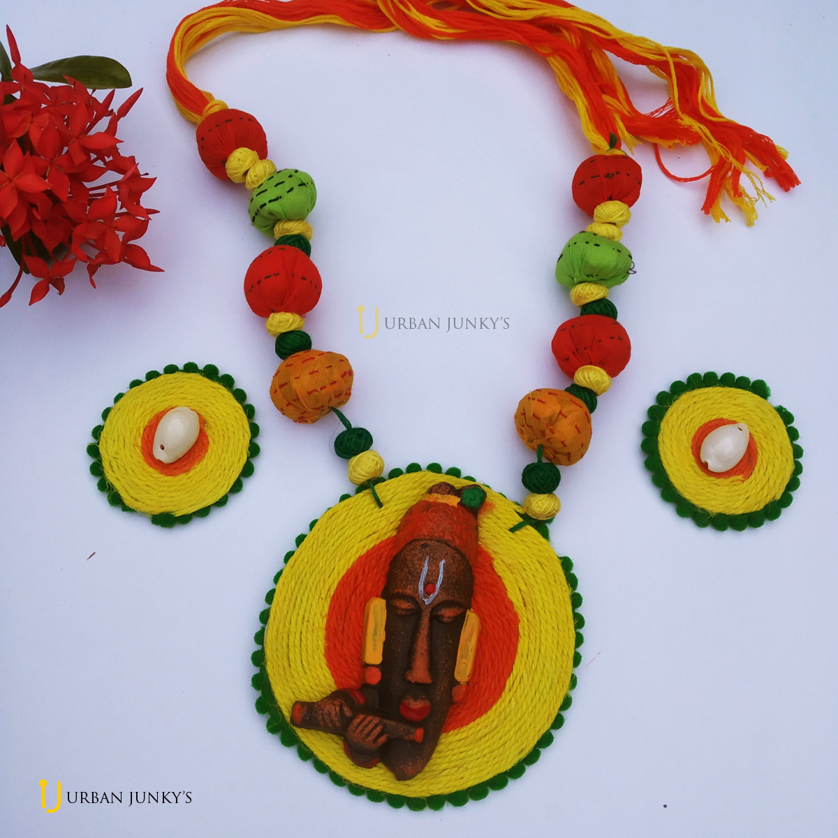 Clay Krishna pendant with jute base.tassel comes with different style with cloth balls.