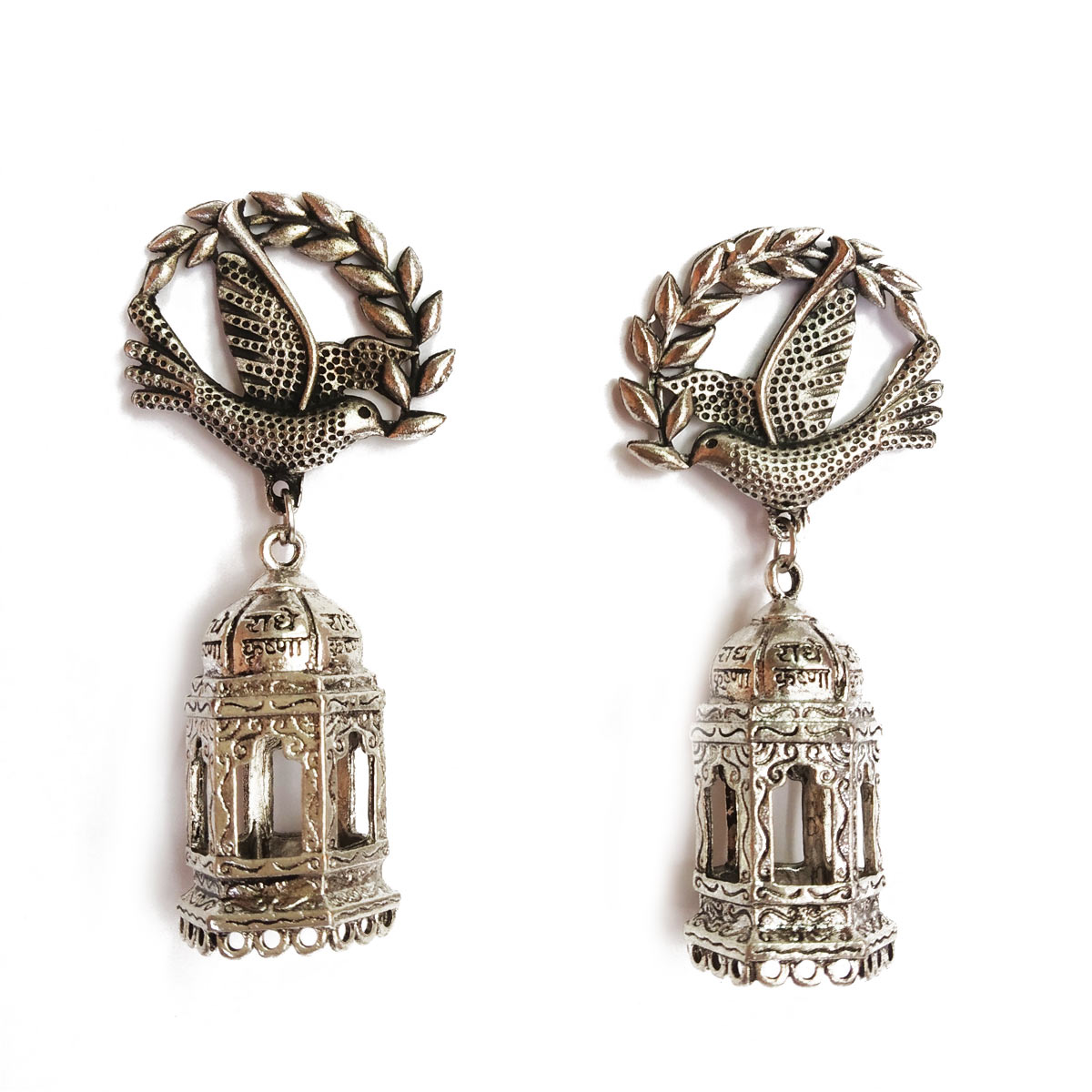 This pair of earrings are artistically unique. It tries to tell a story of freedom and self confidence. Its oxidised. Having a flying bird out of its cage symbolises many things.