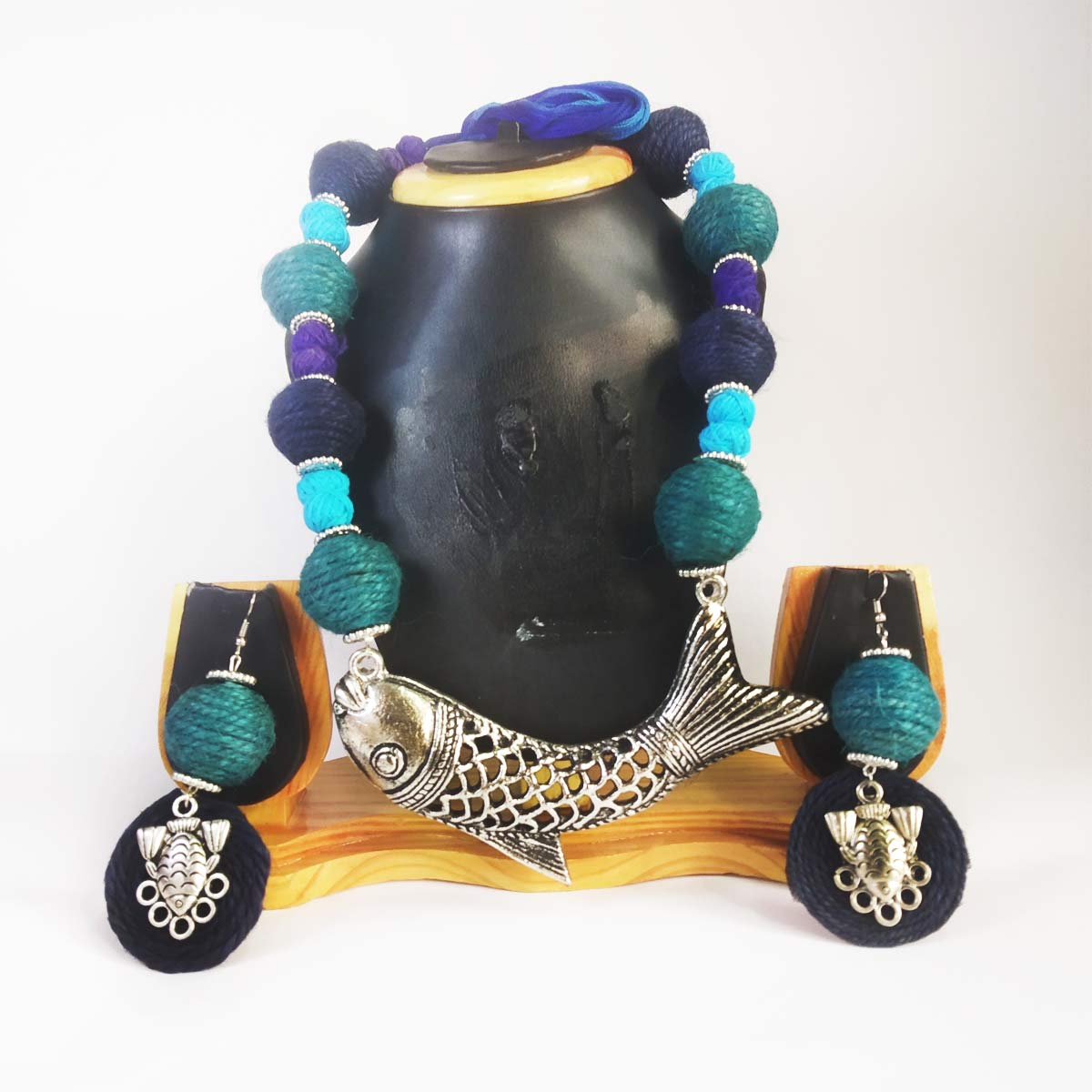 Blue Jute beads and oxidised fish pendant necklace. Comes with matching earrings.