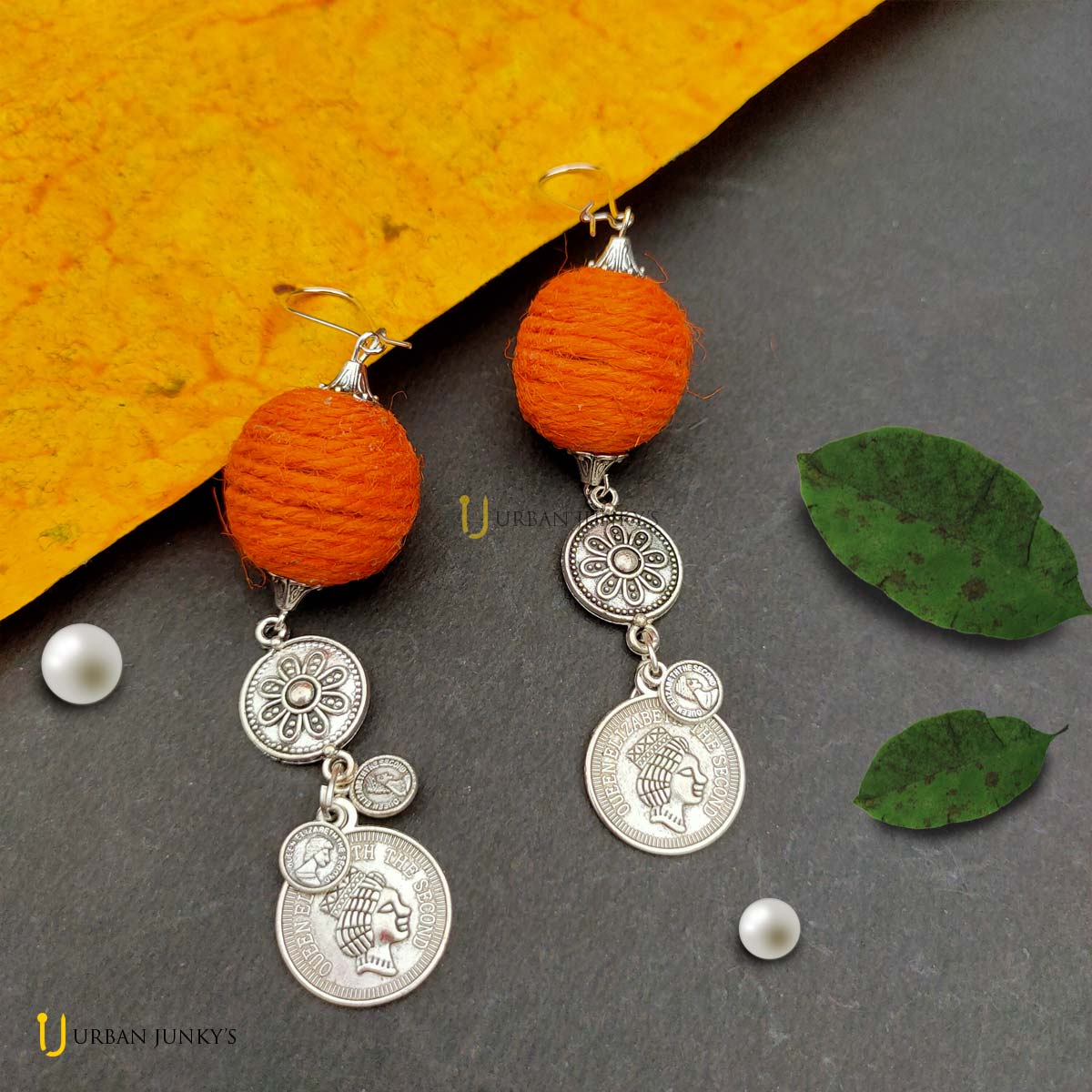 Jute based coin earrings. It is handmade jewellery. it is handcrafted with jute balls and silver oxidised coins. Beautiful and affordable.