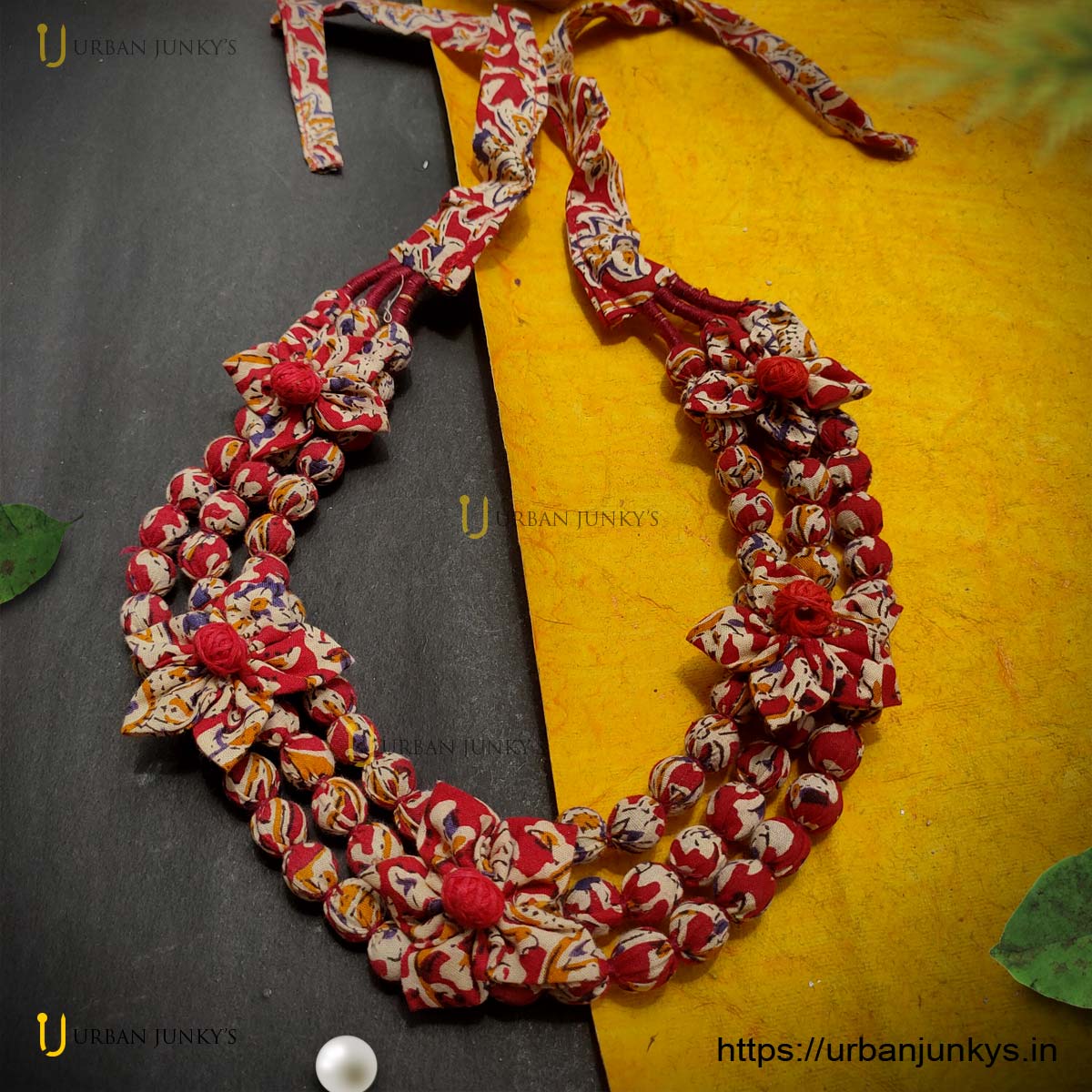 Kalamkari 3 layer necklace in red cotton ball and kalamkari red fabric