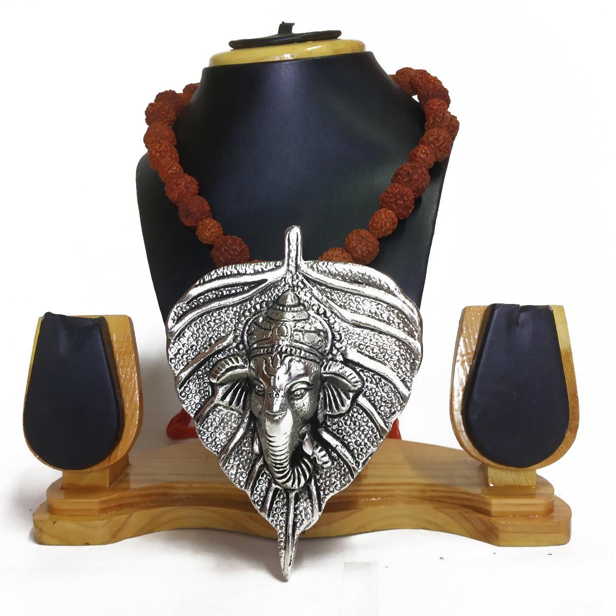 This necklace is having a leaf ganesha pendant. It is rudraksh beads thread material. It goes well with Indian ethnic wear.