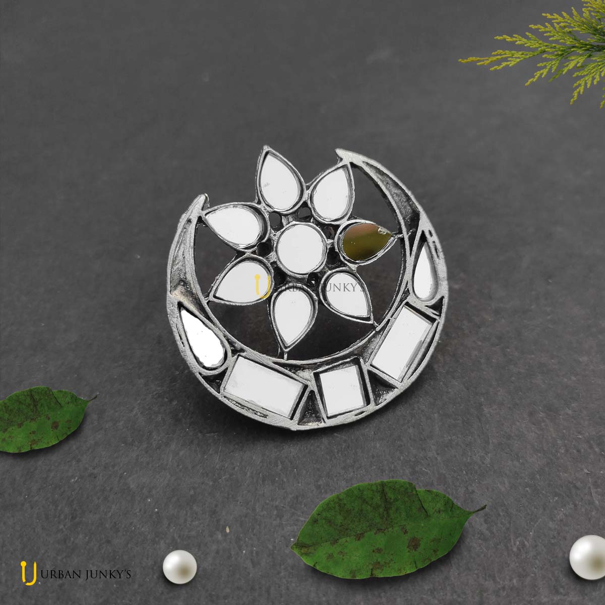 This is a beautiful finger ring designed as moon and star. It is studded with mirror work. Definitely adorable.