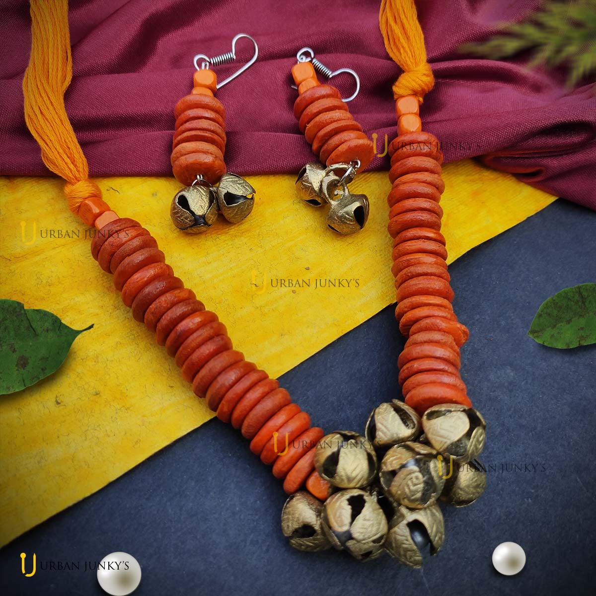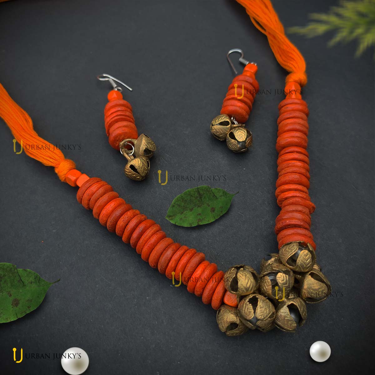 This handmade set is designed with wooden beads. Orange in colour, ghunghroo attached at the bottom. Elegant handmade jewellery.