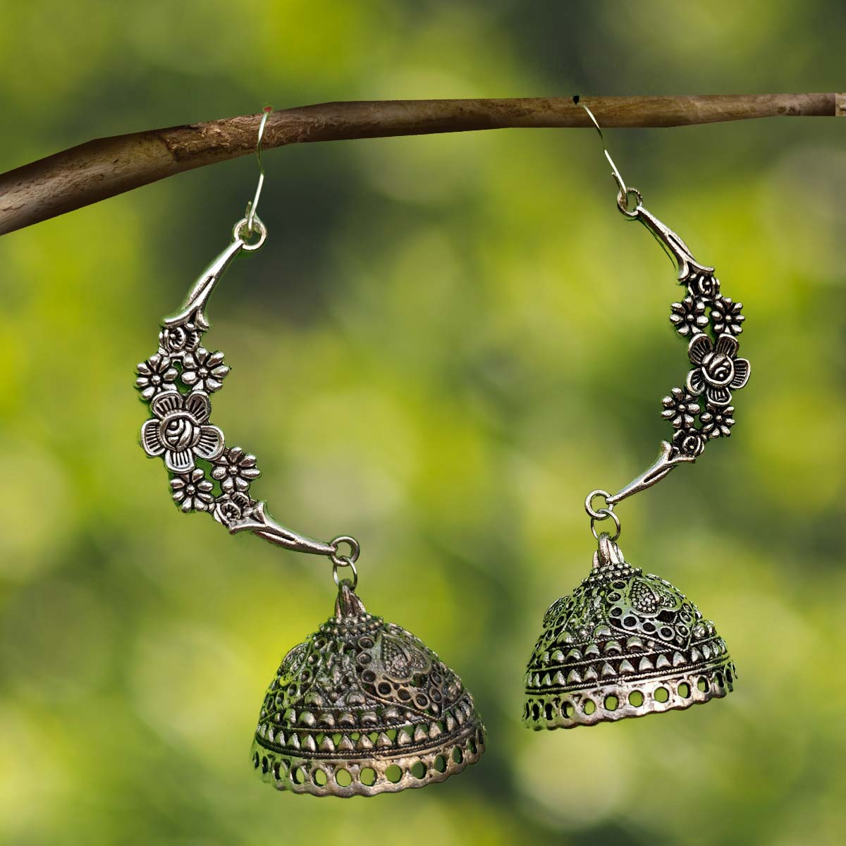 This unique shaped jhumka is made with oxidised metal. It is big and has unique bow shape. Must buy.