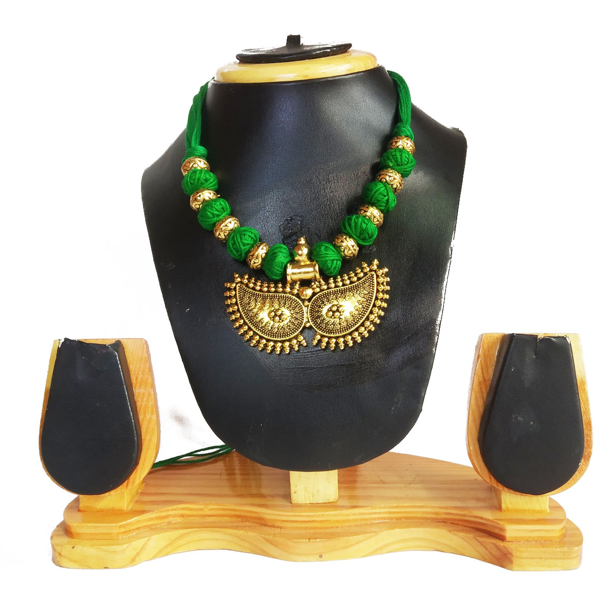 This is a cotton beads necklace. It comes with a golden oxidised pendant and looks classy.