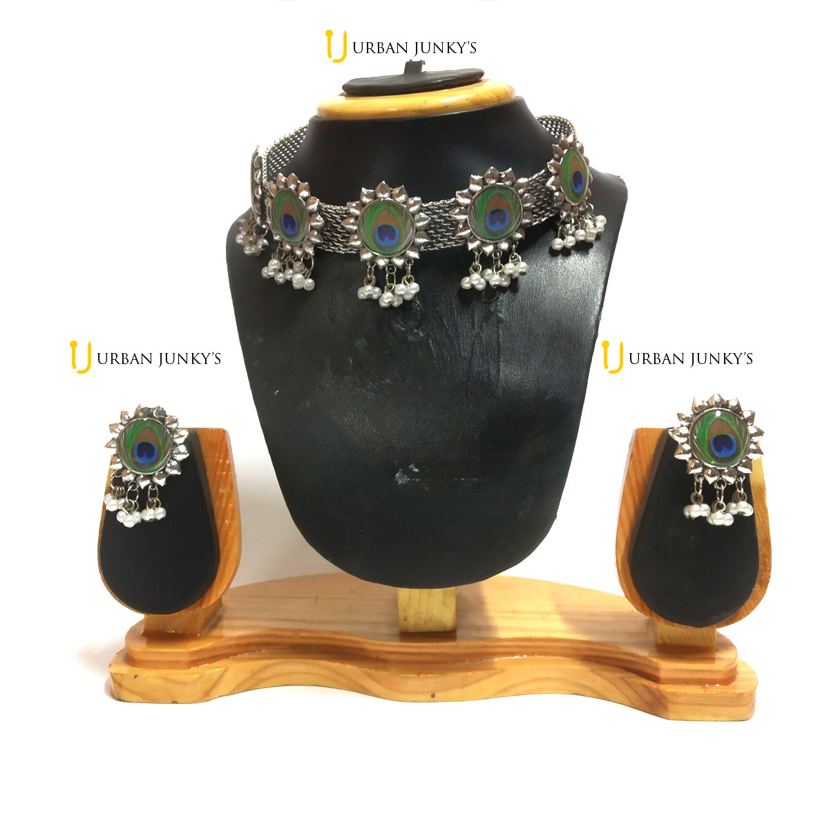 This jewellery set has peacock style in its every stuff. It is silver in colour and trendy.