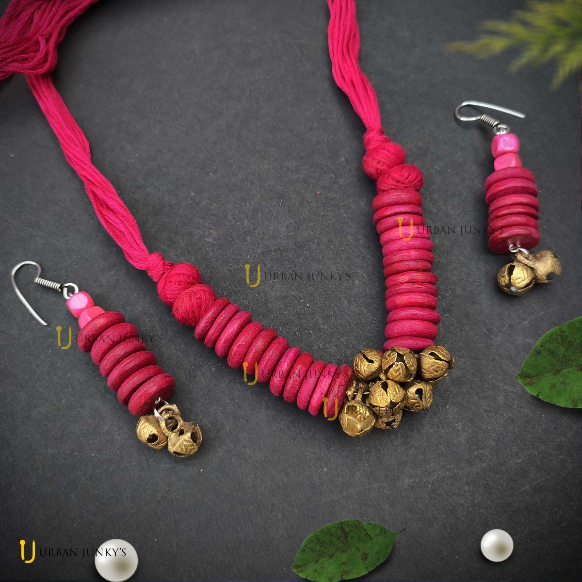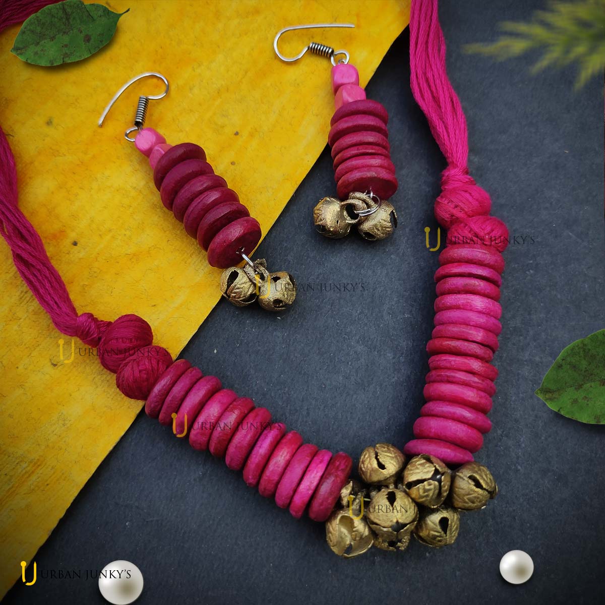This handmade set is designed with wooden beads. Pink in colour, ghunghroo attached at the bottom. Elegant handmade jewellery.