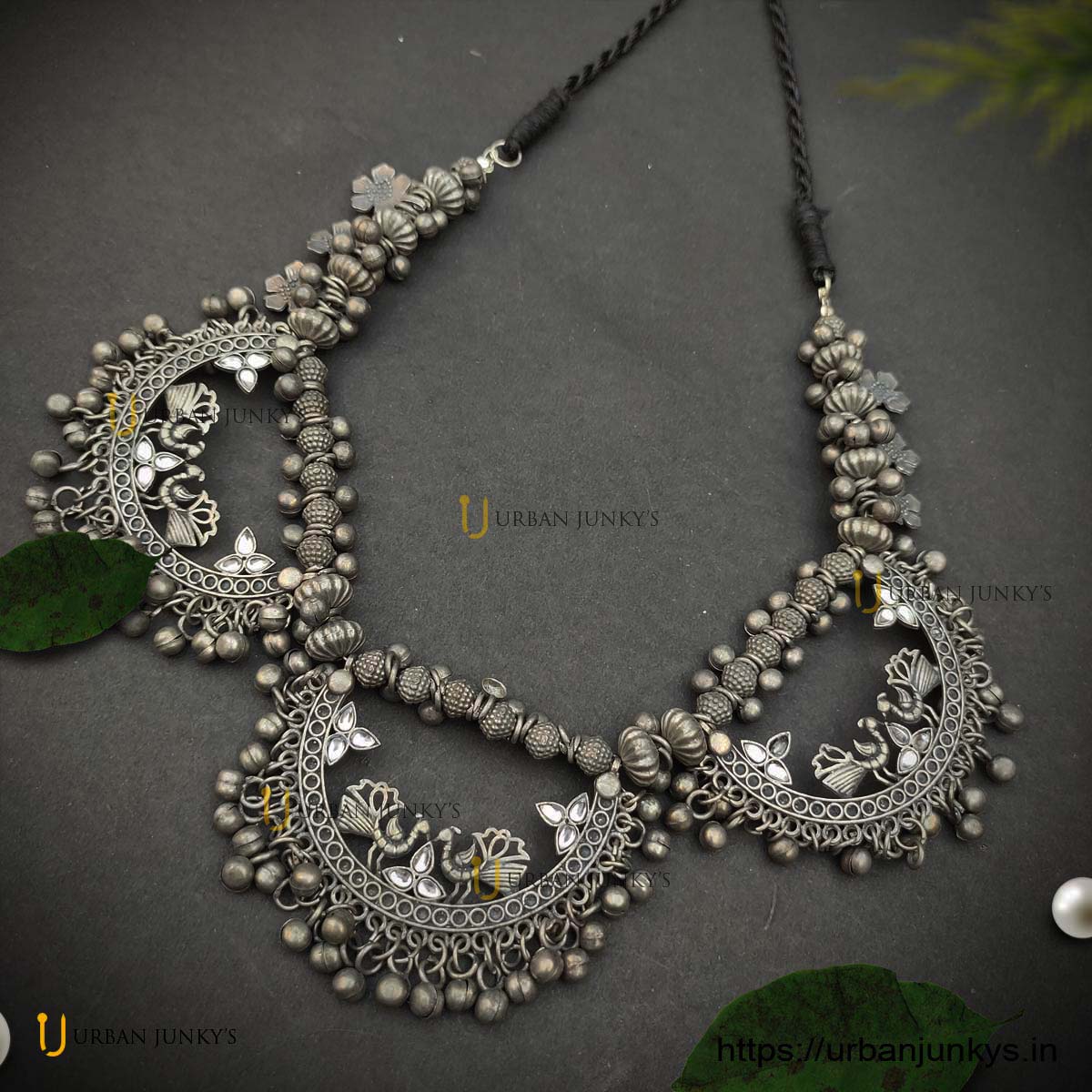 This is a black polished necklace with three peacock pendant. It has so many design works. It One of the finest neck piece.