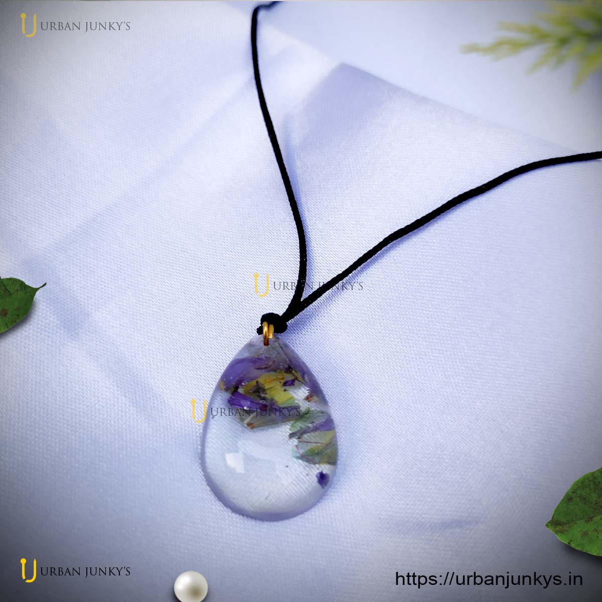This is a cute and beautiful resin necklace. It has a water drop motif. Comes with dry lilac flowers.