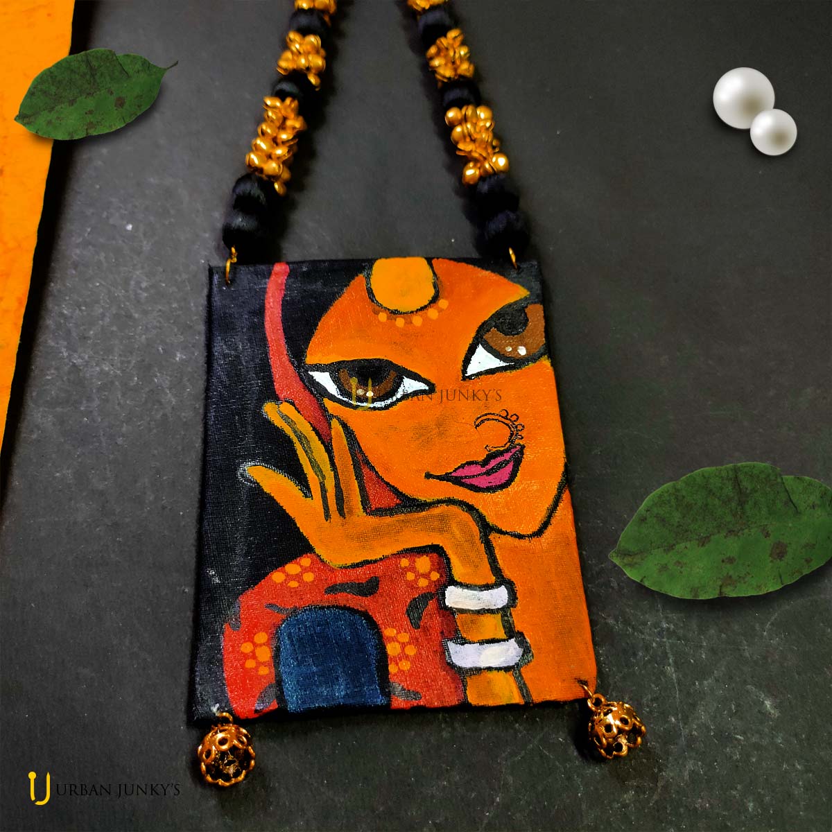 This necklace’s pendent is hand painted, it is a stylized face of a woman. This necklace is artistically done. It has a creative value.