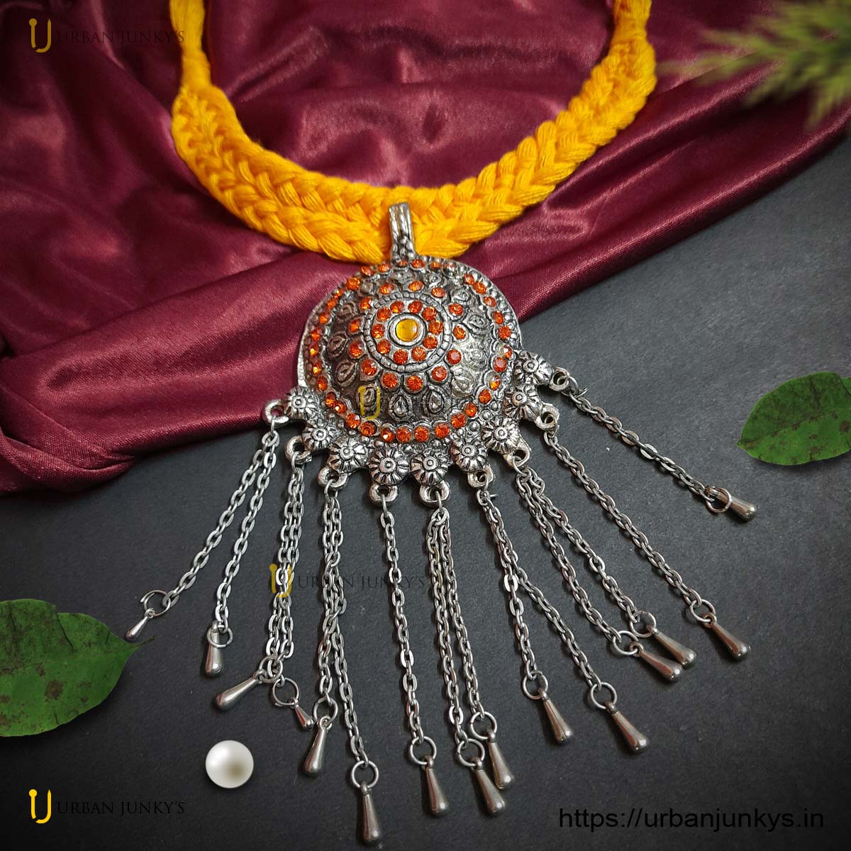 This is a beautiful Radha Krishna necklace with chemical beads. It is silver oxidised and the base colour is blue, green, yellow.28